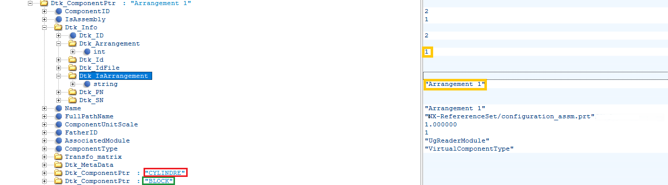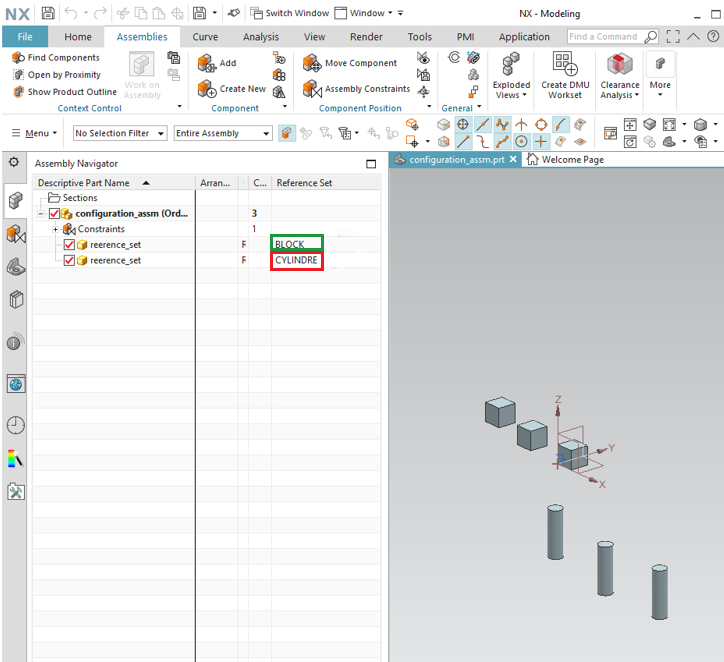 - 'configuration_assm.prt' is an assembly containing one Arrangement (Arrangement1) containing 2 instances of same part ('reference_set.prt') but activationg different reference_set (CYLINDRE , BLOCK)