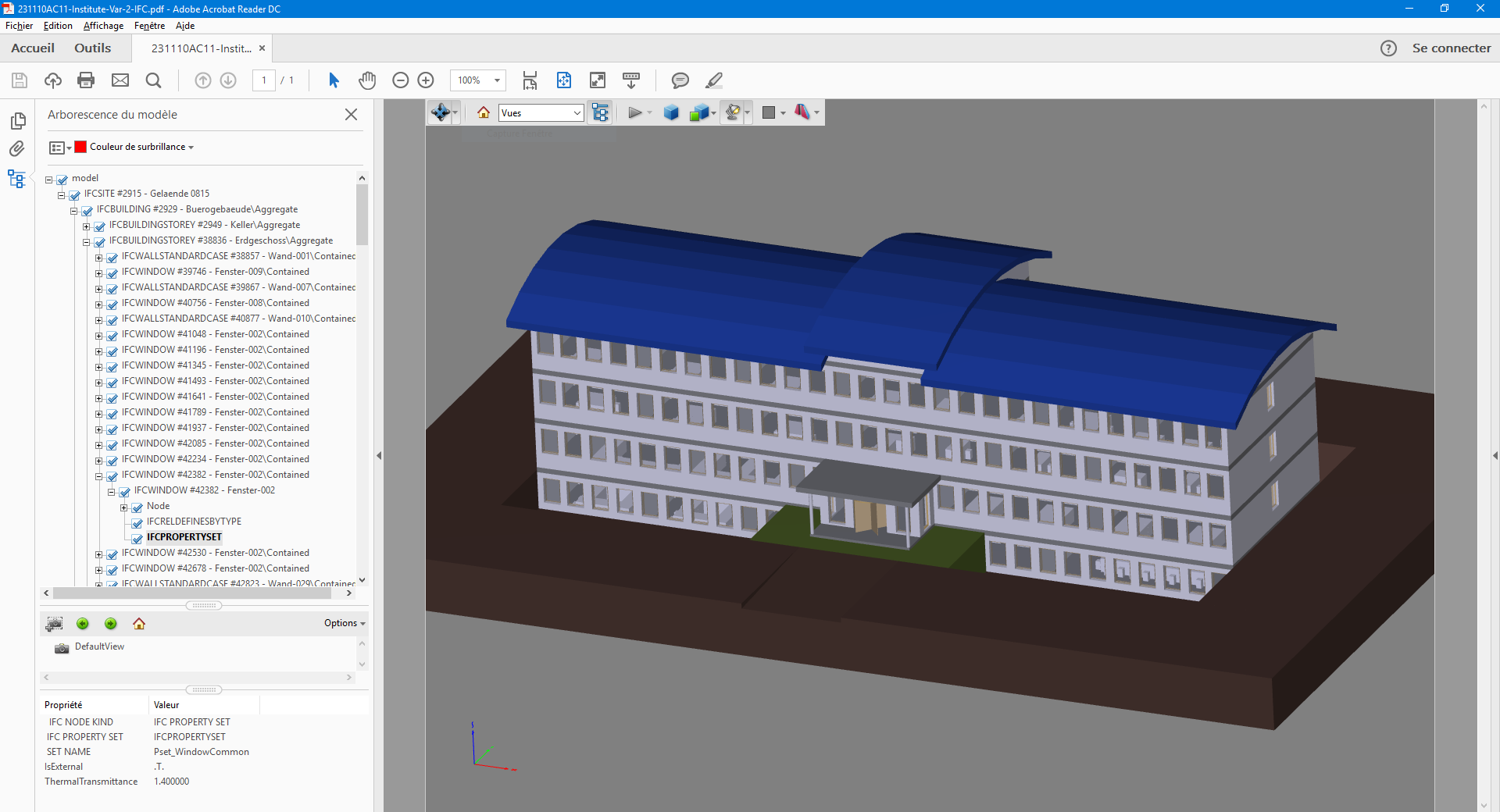 Fichier IFC converti en PDF 3D avec CrossManager. Le fichier peut ainsi être ouvert dans Adobe Acrobat Reader™ pour le visualiser. L’arborescence du modèle et les propriétés sont également converties.