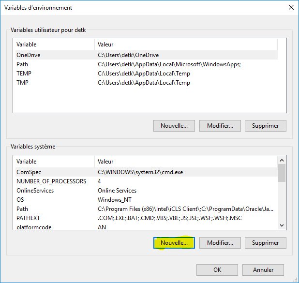 Cliquez sur [Nouvelle...] dans "Variables système".
